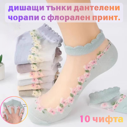 🔥10 ζευγάρια αναπνεύσιμες λεπτές δαντελένιες κάλτσες με φλοράλ τύπωμα.