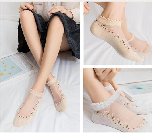 🔥10 pares de calcetines finos de encaje transpirables con estampado floral.