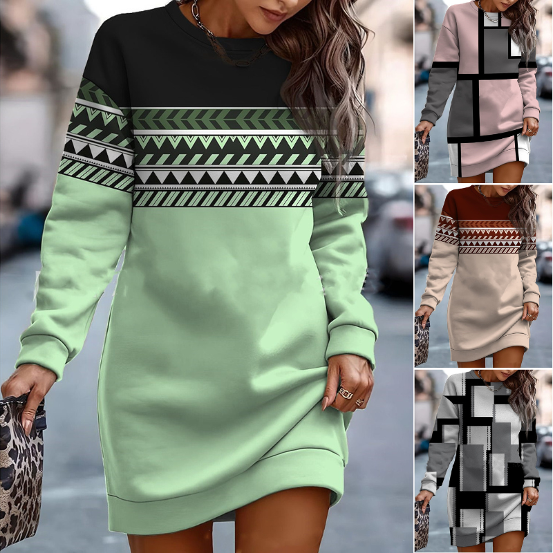 🎄🎄【S-3XL】Nový podzim a zima s potiskem v kontrastních barvách kulatý výstřih mikina šaty s kulatým výstřihem-3738724