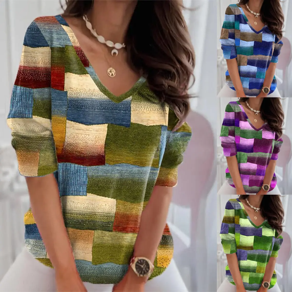 【S-3XL】V-neck top s kostkovaným potiskem 10628904 3565788